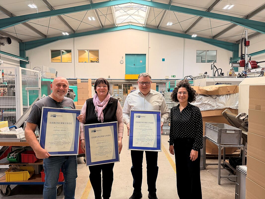 Yvonne Schieder, Managing Director of the Amberg-Sulzbach Chamber of Industry and Commerce, presented the certificates to the two jubilarians and to Daniel Weidner for the company's 25th anniversary.